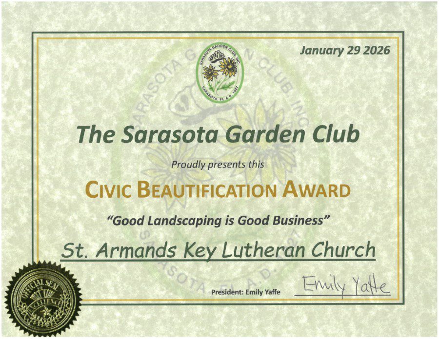 The Sarasota Garden Club is presenting annual awards for outstanding landscaping. This effort promotes the beautification of the Sarasota community. This organization acknowledges SAKLC’s exceptional landscaping efforts, which have earned us this award.